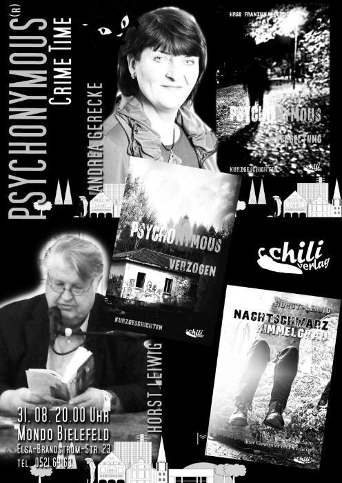 Am 31.08. um 20.00 Uhr geht es abermals kriminell in der Buchhandlung und Galerie Mondo, Bielefeld, zu. Zu Gast sind Andrea Gerecke und Horst Leiwig, beide